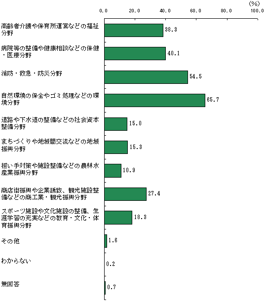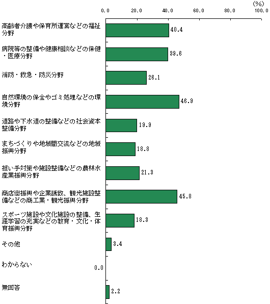 | 問9 | (問8で「推進すべきである」または「どちらかといえば推進すべきである」と答えた方におうかがいします) どのような行政分野で事務の共同処理に取り組んだらよいと思いますか。あてはまるもの3つまで選んで○をつけてください。 |