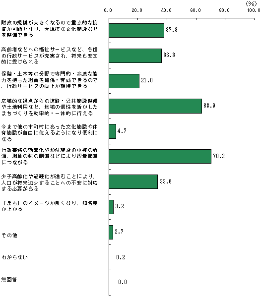 | 問14 | (問12で「必要があると思う」または「どちらかといえば必要があると思う」と答えた方におうかがいします) あなたがお住まいの市町村が合併を検討するとすれば、その規模・範囲はどの程度が望ましいと思いますか。あてはまるもの1つだけに○をつけてください。 |
